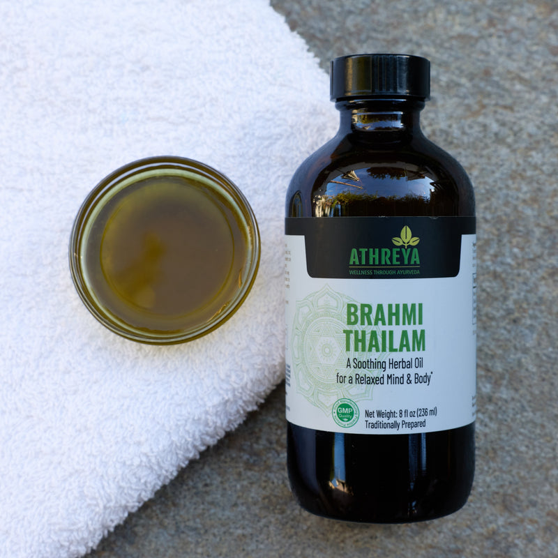 Brahmi Thailam is traditionally applied to the scalp to support calm, focus, and clarity. Brahmi has long been valued in Ayurveda for its ability to nourish the mind and encourage mental steadiness.