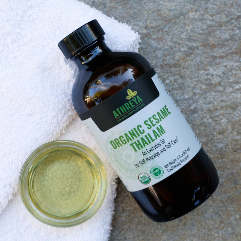 Sesame Thailam is the foundational oil of Ayurvedic practice. Traditionally used in daily self-massage (abhyanga), sesame oil is warming, penetrating, and deeply nourishing. It supports circulation, joint comfort, and overall steadiness.