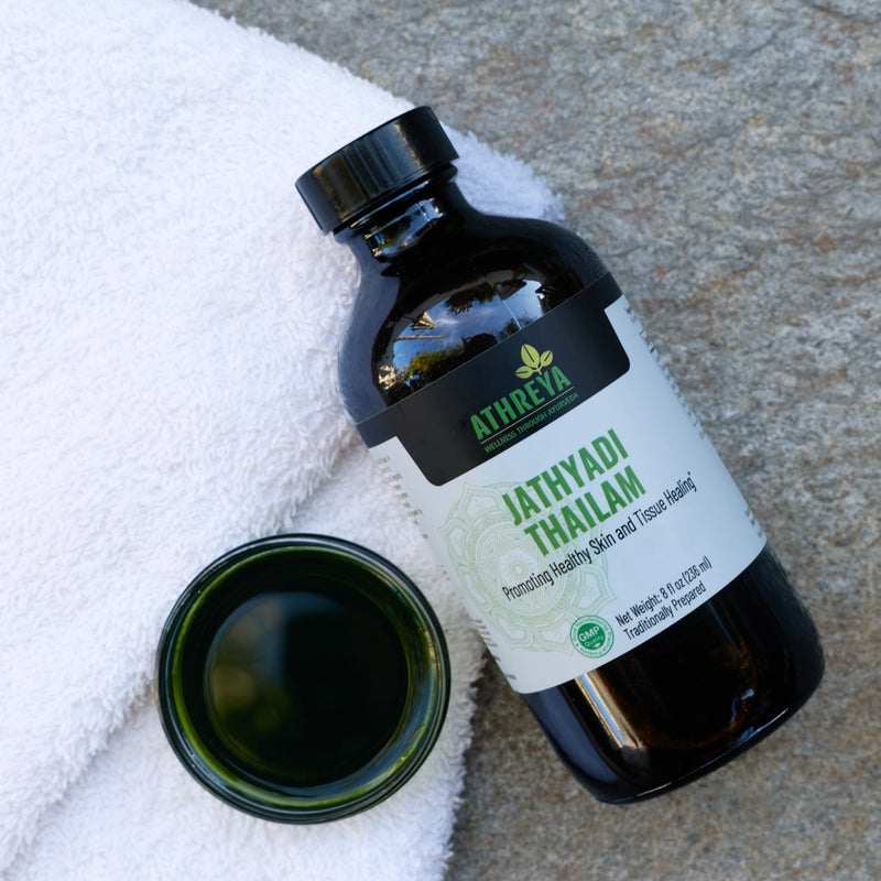 Jathyadi Thailam is traditionally used to support skin repair and soothe areas of irritation, dryness, or disruption. Carefully prepared herbal oils like Jathyadi are applied externally to nourish and protect compromised skin.