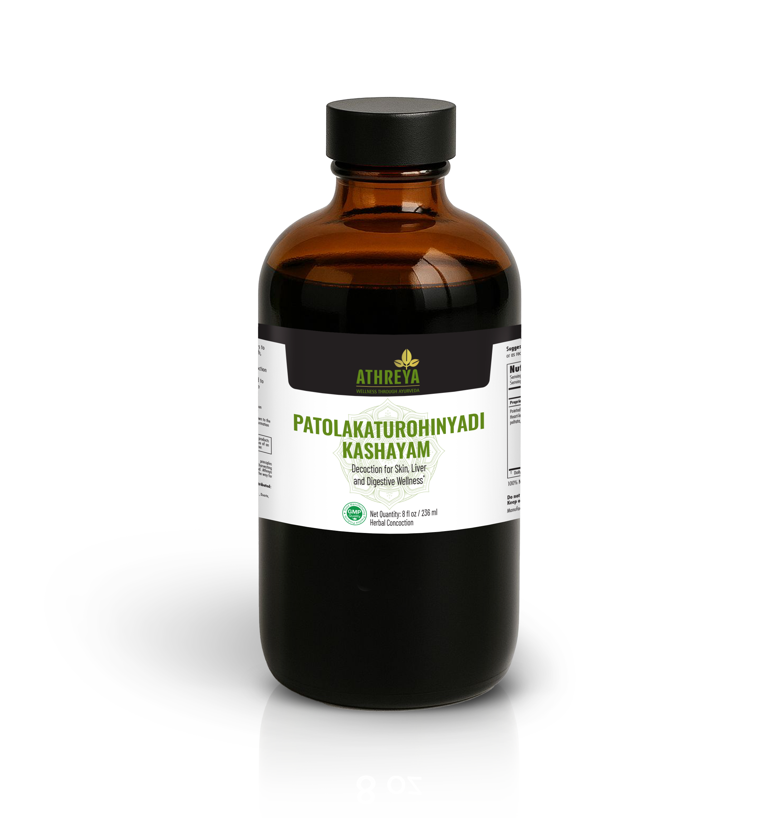 Patolakaturohinyadi Kashayam is a traditional Ayurvedic herbal decoction prepared with Patola, Katurohini, Neem, Guduchi, and Vasa. Revered in Ayurveda for its cooling and balancing properties, it is traditionally used to support skin wellness, promote liver health, and help maintain digestive comfort and overall metabolic functionÂ