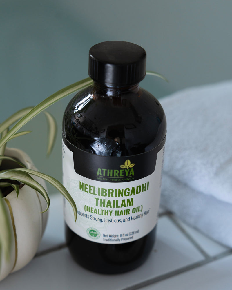Formulated with a nourishing sesame oil base and enriched with Bhringraj, Neelini, Amalaki, and other classic Ayurvedic botanicals that support scalp and hair health. The blend includes naturally antifungal and antibacterial herbs to maintain a clean, balanced scalp environment.