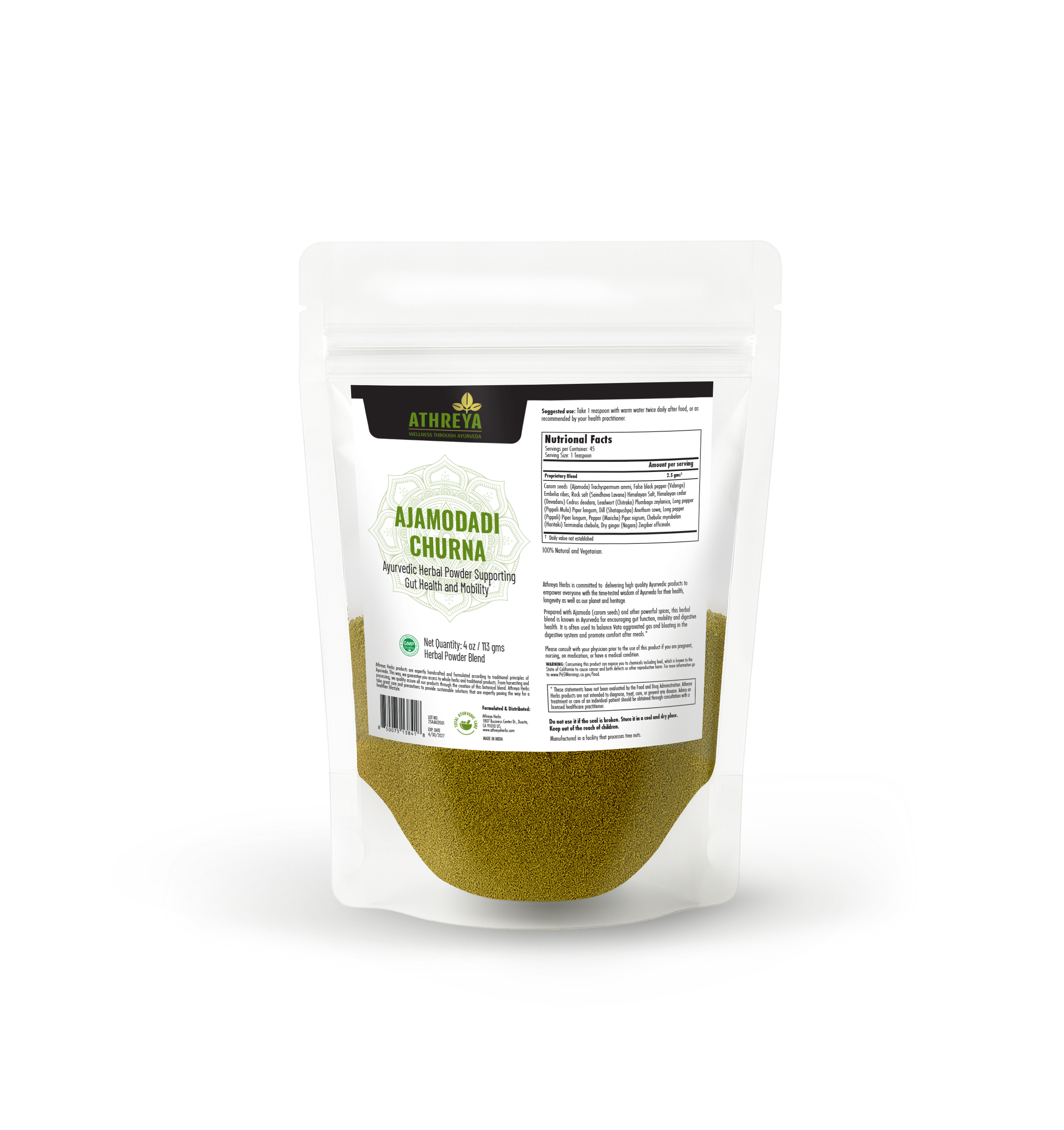 Prepared with Ajamoda (carom seeds) and other powerful spices, this herbal blend is renowned in Ayurveda for promoting gut function, mobility, and digestive health. It is often used to balance Vata aggravated gas and bloating in the digestive system and promote comfort after meals.