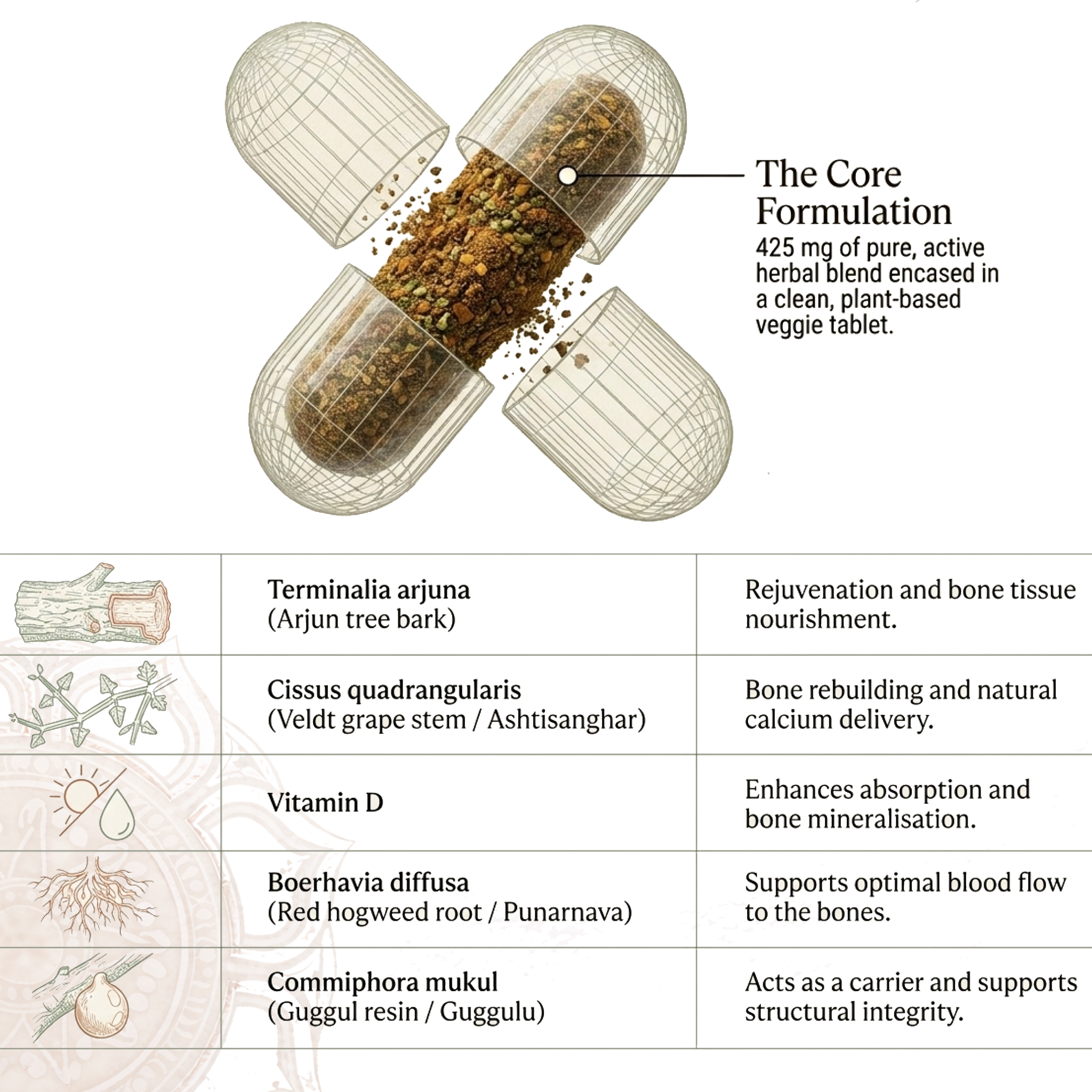 The other main herbs include the Boerhavia diffusa(or Punarvana) and Commiphora mukul (or Guggulu). The combination of these herbs helps promote bone health and help maintain blood flow to the bones and joints. They do this by supporting the elimination of toxins accumulating in our body. The unique blend of herbs balance excessive Kapha to encourage a healthy anti-inflammatory response in our body.