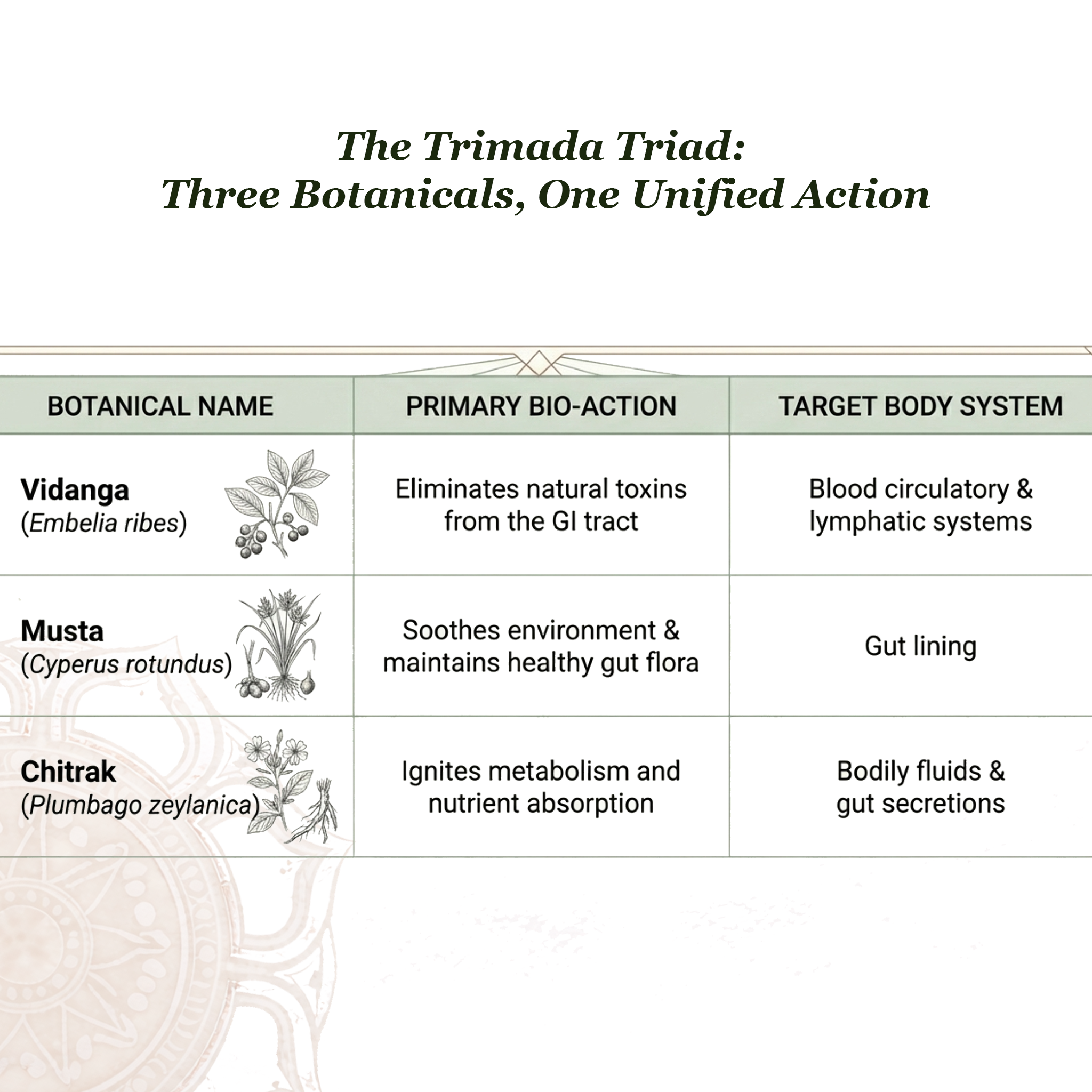 Individually, each herb plays a pivotal role in promoting our wellbeing. Vidanga supports the elimination of natural toxins accumulating in the GI tract. It also promotes natural cleansing of the blood circulatory system and the lymphatic system. The combination of these actions and the presence of other herbs support assimilation. It subsequently rejuvenates the natural absorption of nutrients.