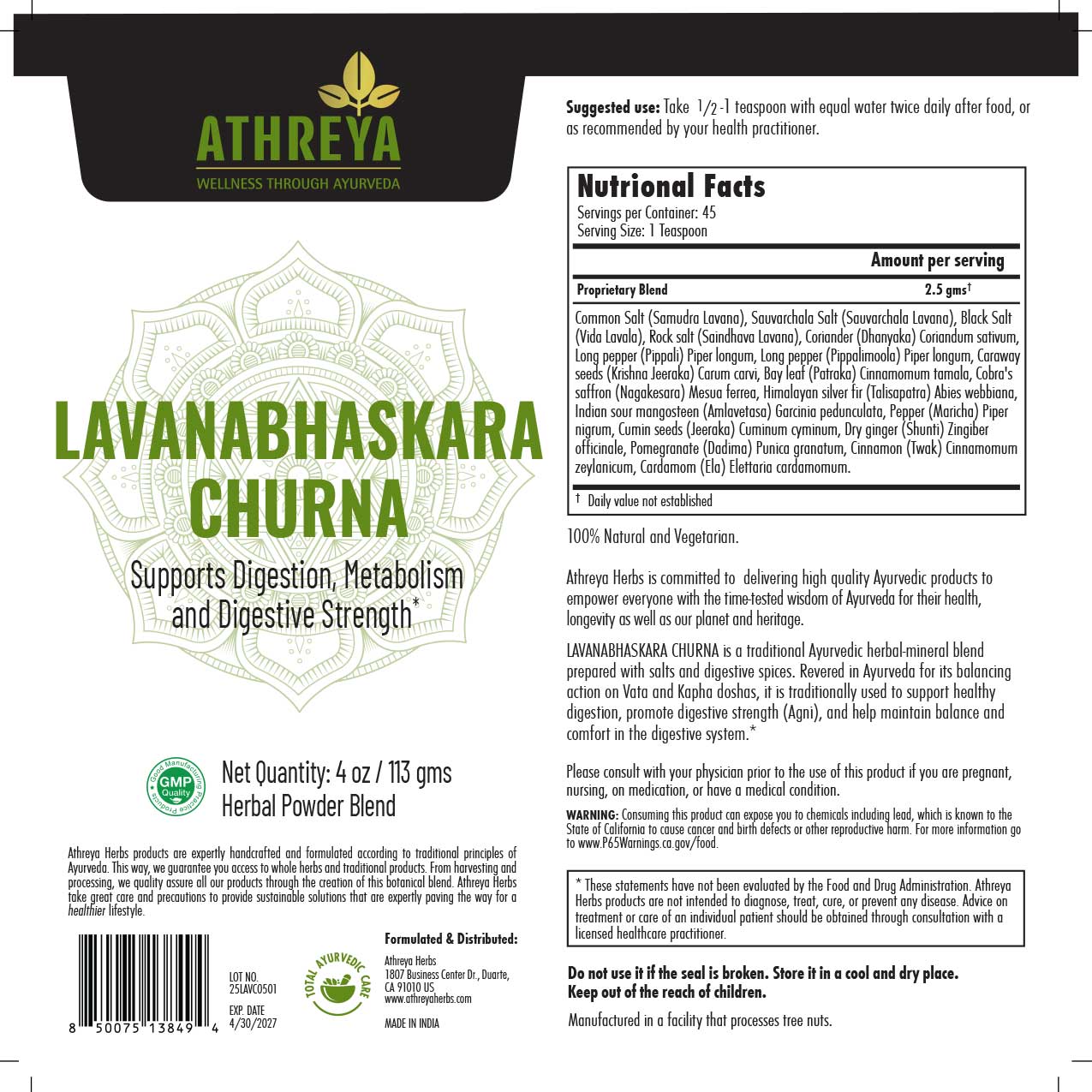 Lavanabhaskara Churna is a traditional Ayurvedic herbal-mineral blend prepared with salts and digestive spices. Revered in Ayurveda for its balancing action on Vata and Kapha doshas, it is traditionally used to support healthy digestion, promote digestive strength (Agni), and help maintain balance and comfort in the digestive system