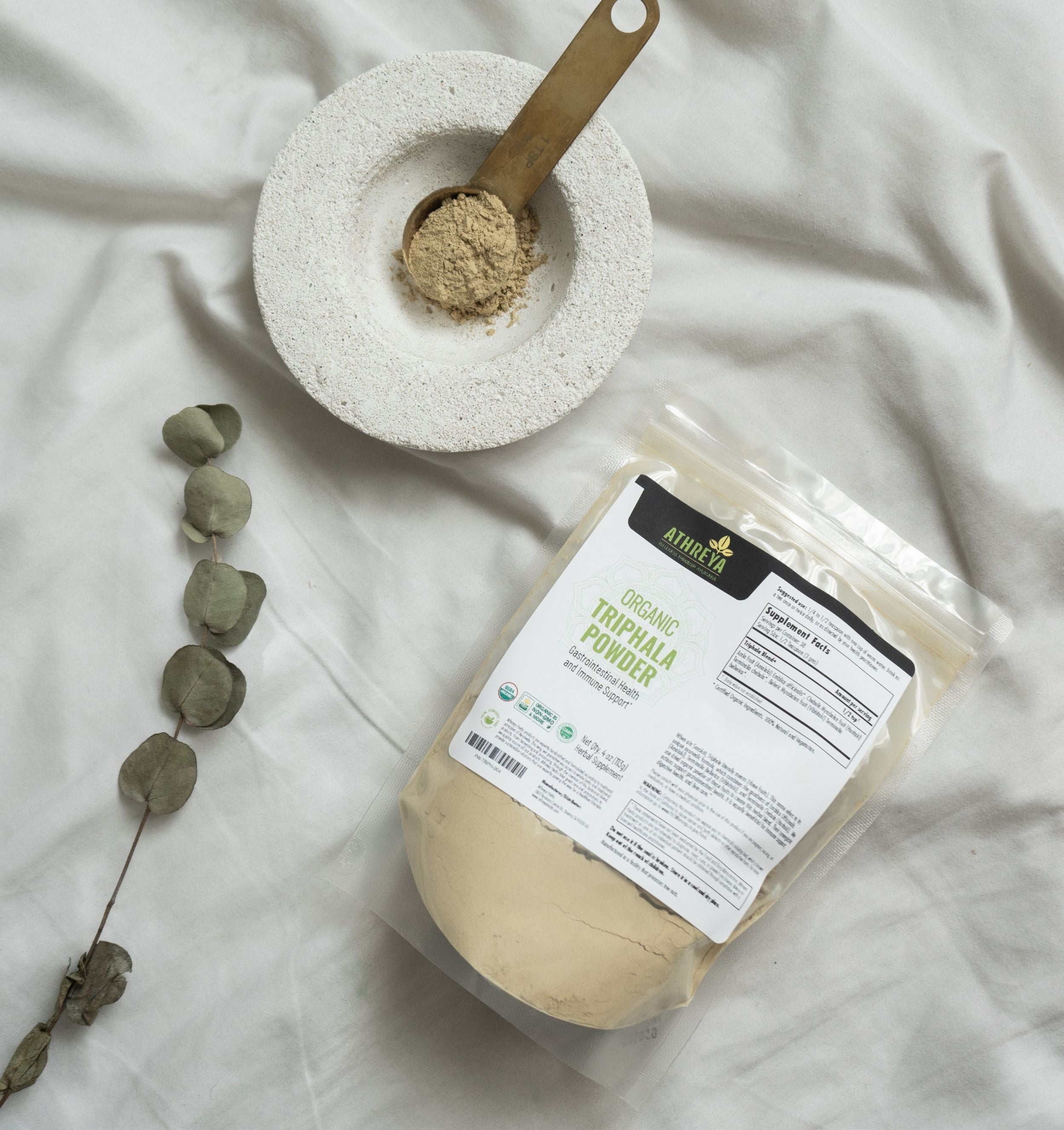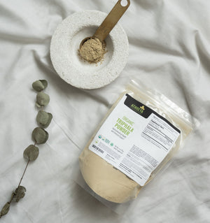 In Sanskrit, Triphala literally means (three fruits). This name refers to its unique Ayurvedic formula, which combines the goodness of Emblica officinalis (Amalaki), Terminalia bellerica (Vibhitaki), and Terminalia chebula (Haritaki). We use dried organic powder of these fruits to create this herbal blend.