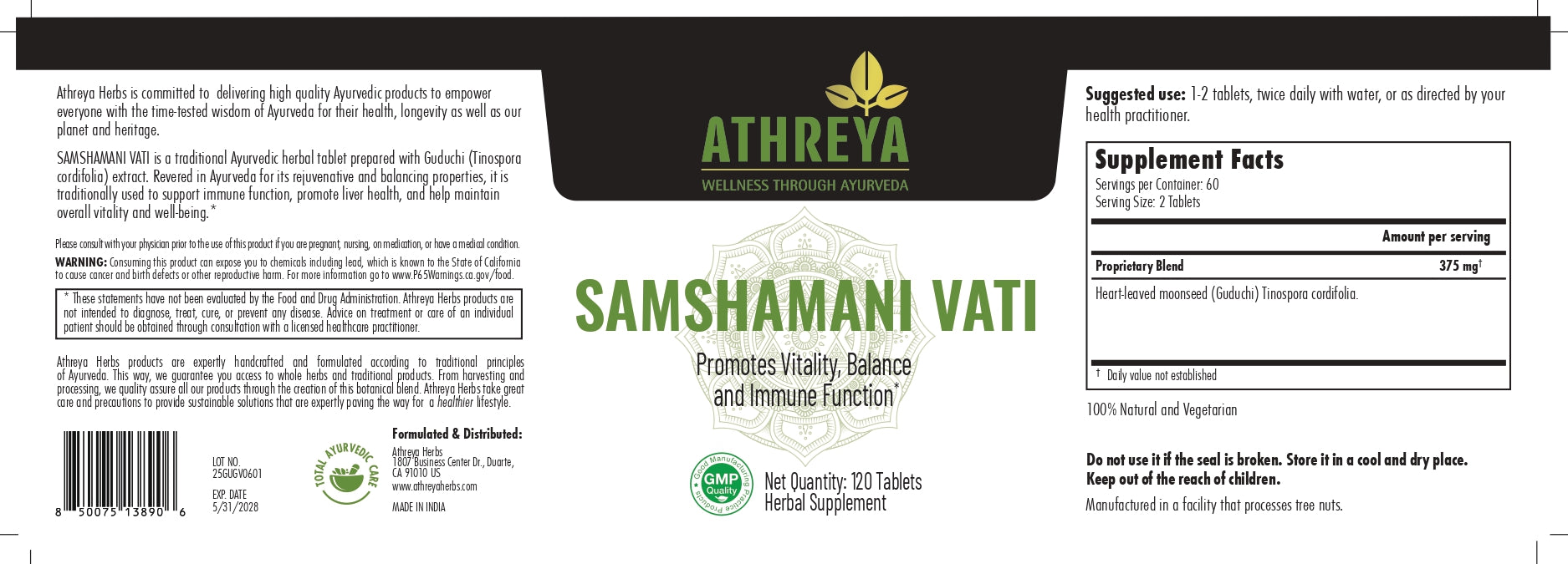 Samshamani Vati is a traditional Ayurvedic herbal tablet prepared with Guduchi (Tinospora cordifolia) extract. Revered in Ayurveda for its rejuvenative and balancing properties, it is traditionally used to support immune function, promote liver health, and help maintain overall vitality and well-being