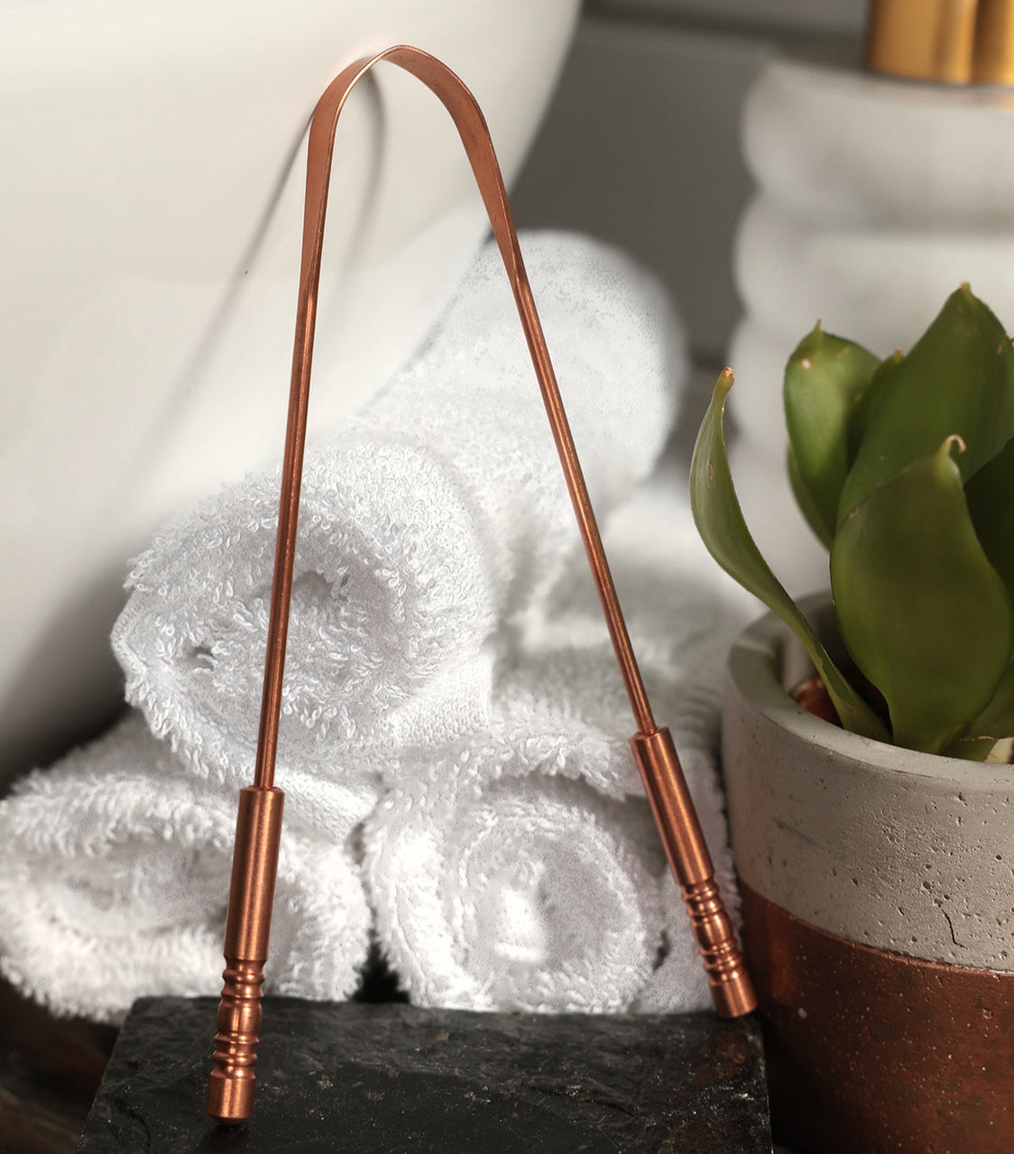 Incorporating tongue scraping into your daily routine is a simple yet effective way to support your oral health, aid digestion, and promote overall well-being according to the principles of Ayurveda. Simply use a metal or copper tongue scraper to gently remove the coating from the back to the front of the tongue each morning before brushing your teeth.