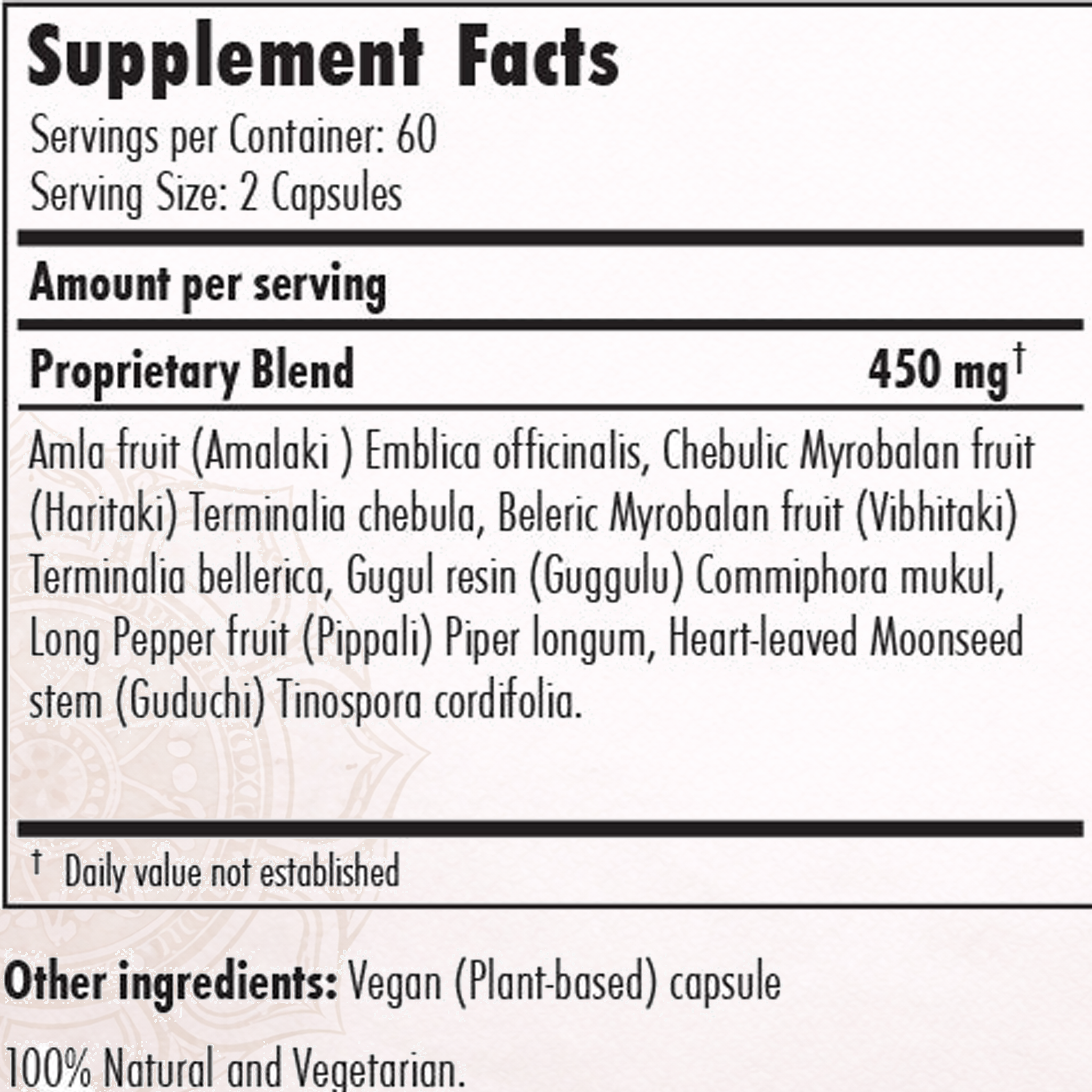 The herbal blend consists of Triphala, Guggulu gum resin, and long pepper. It supports blood circulation in the entire and overall health by preventing the accumulation of toxins in the blood and digestive tract. It also helps protect the gut mucosal membrane and support the veins and tissues of the lower colon, mainly to the structures of elimination.