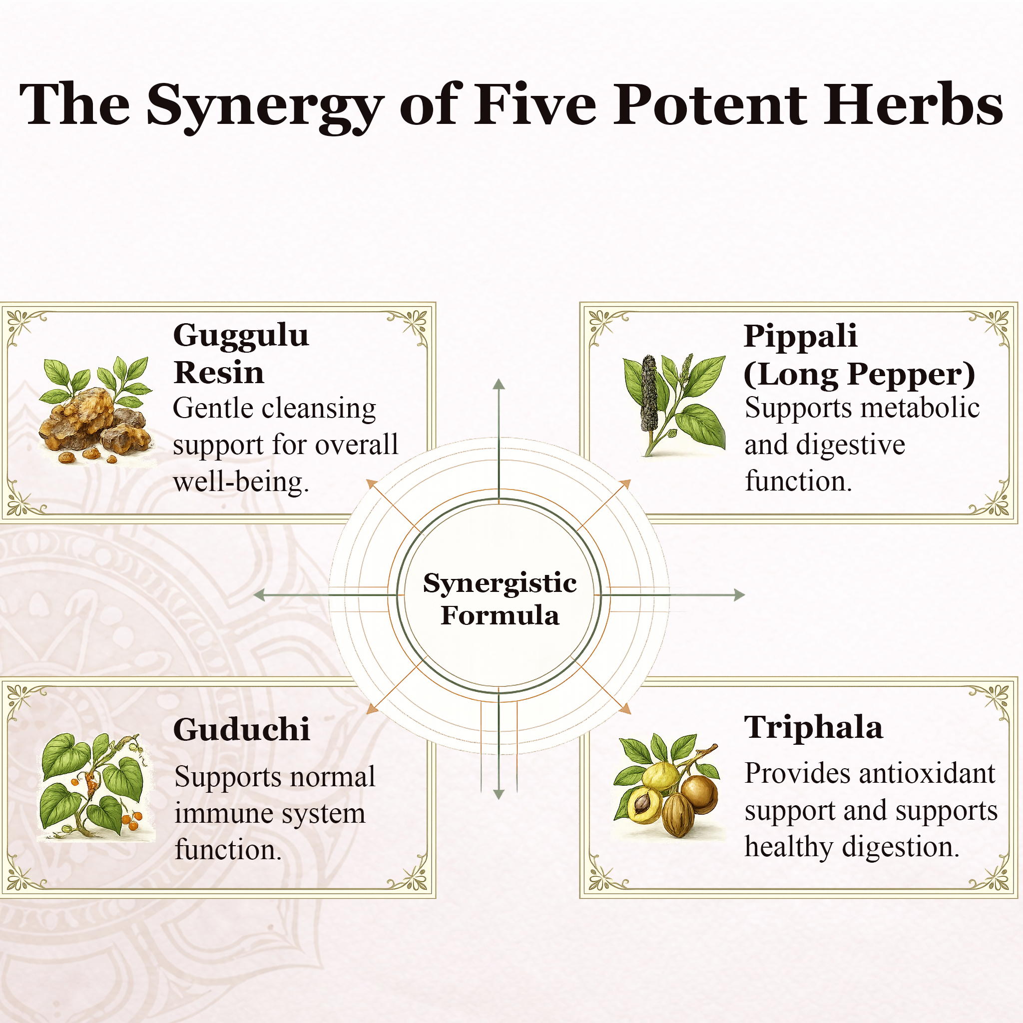 The five potent herbs in Secure Gut (Triphala Guggulu) create a complex, effective herbal blend mentioned in Ayurveda. It supports the digestive system, metabolism and body energy.